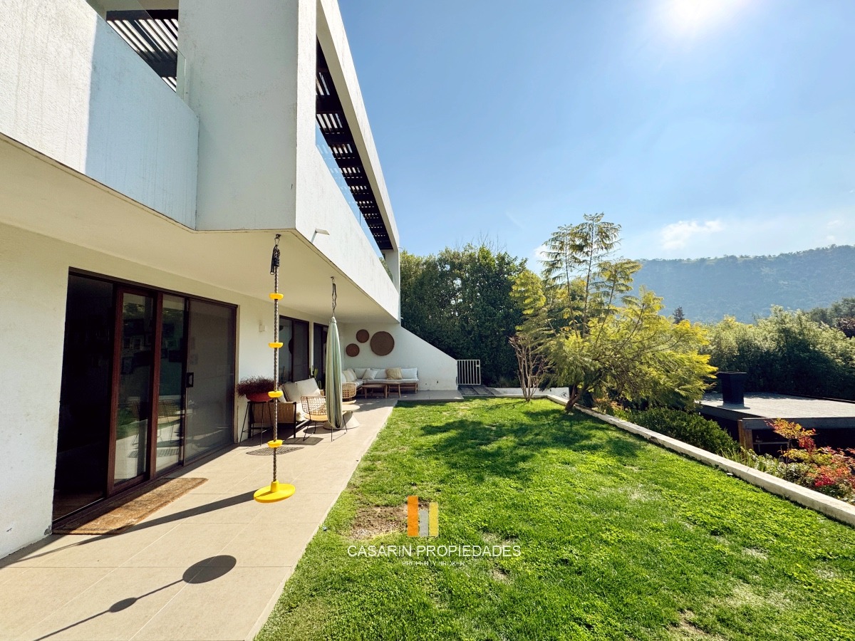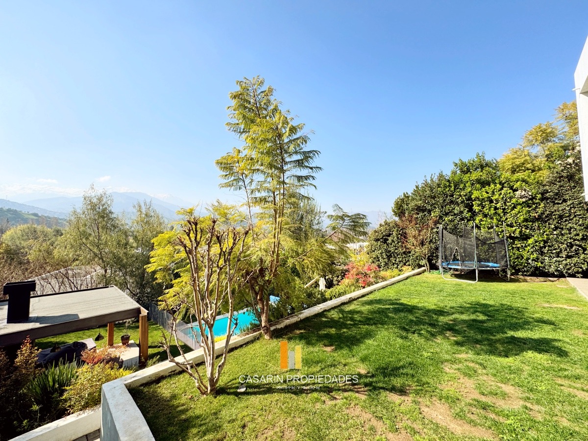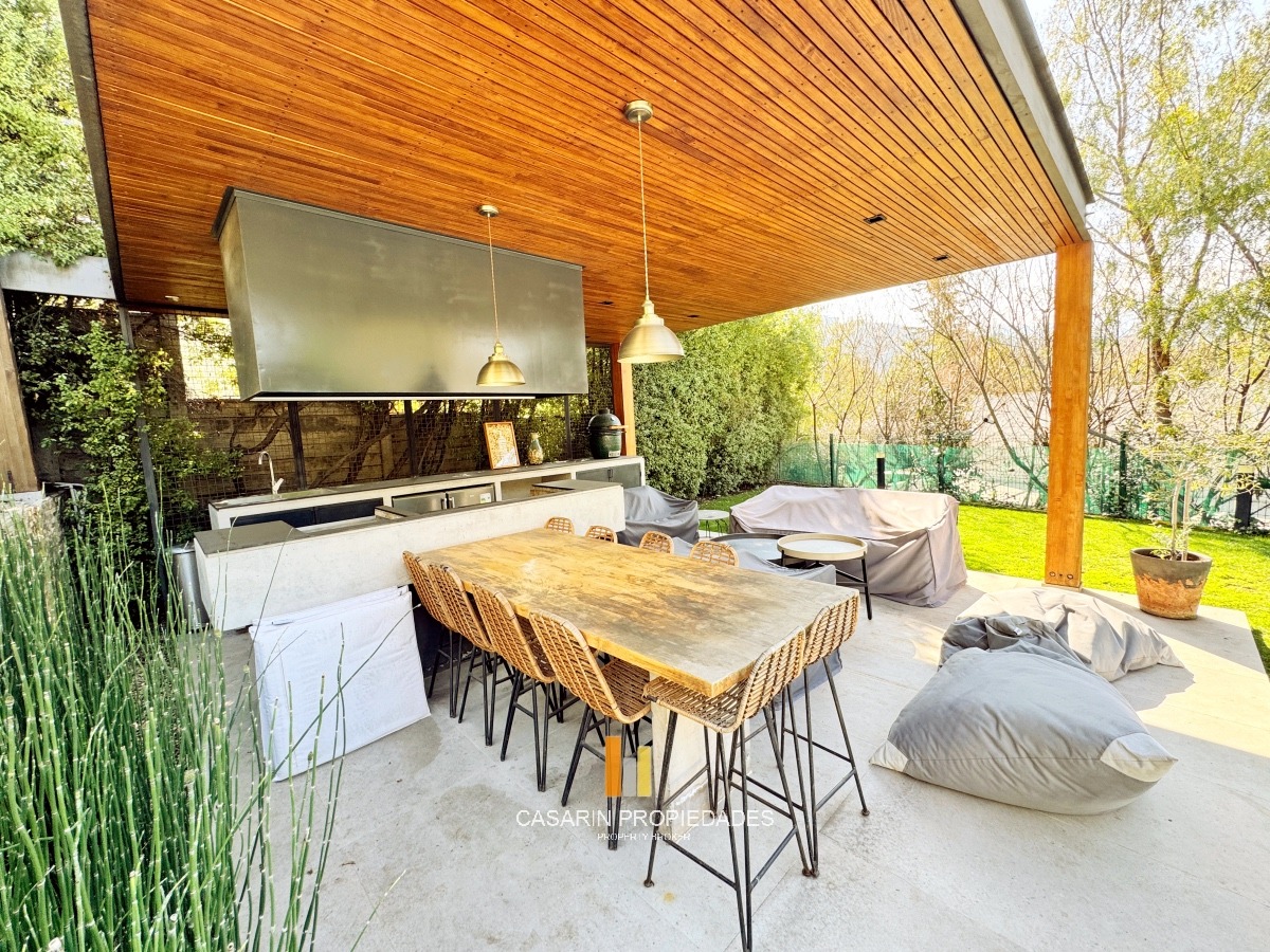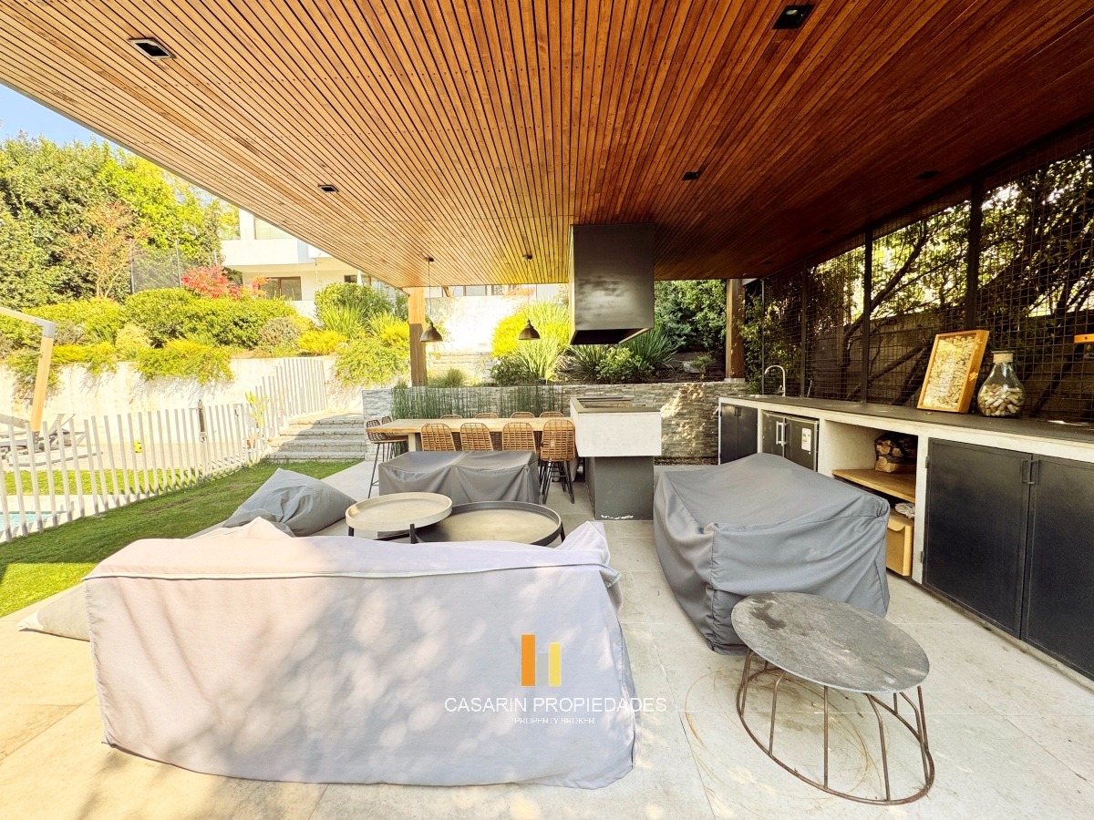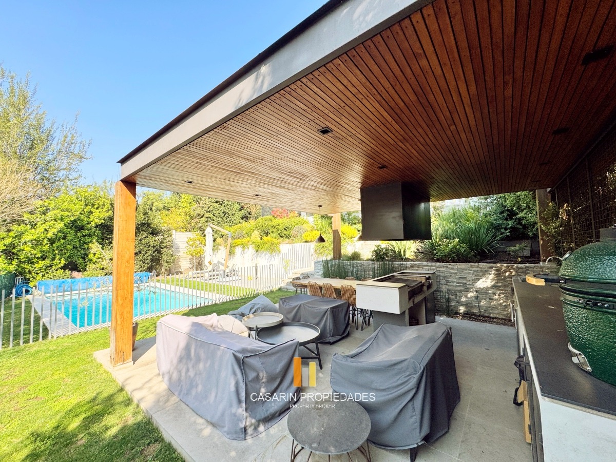 El jardín tiene 2 niveles, el primero con pasto. Bajando un nivel mas un espectacular quincho con piscina temperada,